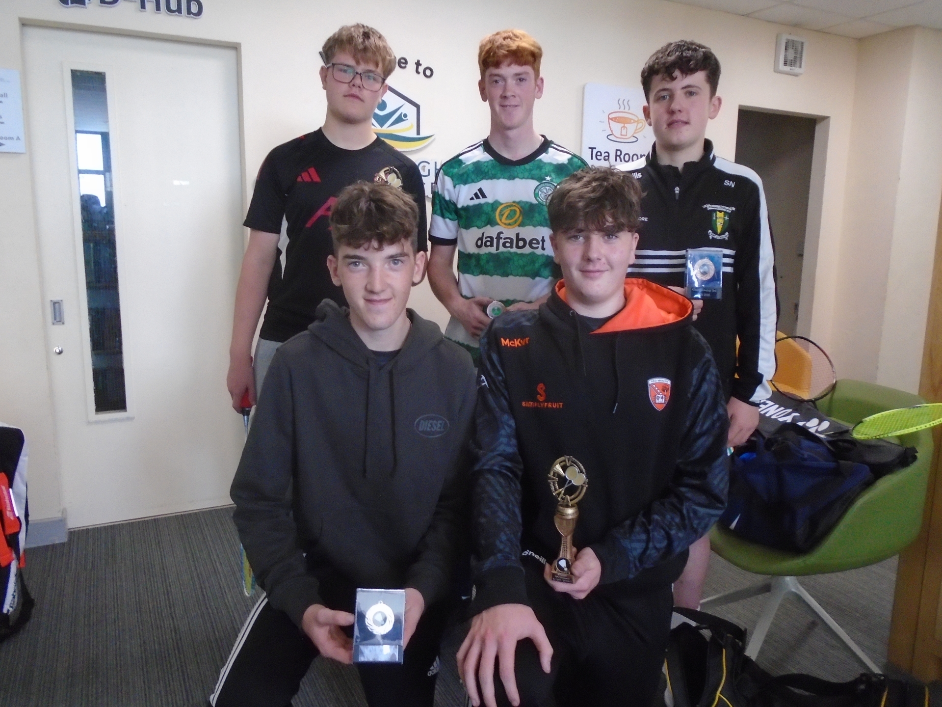 ABOVE: U20 Boys: Championship and Plate prize winners in the U20 Boys Offaly Juvenile Singles played in Mucklagh Community Centre. Back Row, Championship players: Maris, Championship Winner; Conor, 4th; Stephen, 3rd. Front Row, Plate players; Eoin, Runner-up, Cian, Plate Winner.