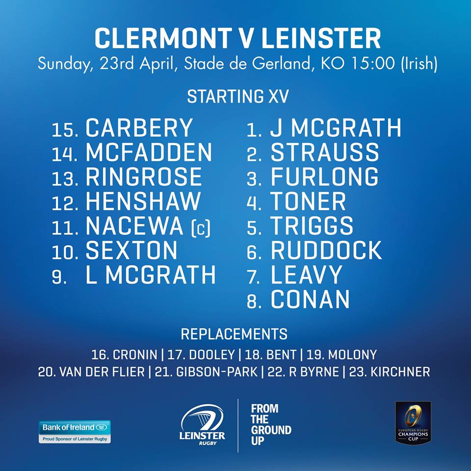 Leinster's starting loosehead prop for the game is Jack McGrath, who was named this week as part of Warren Gatland's British and Irish Lions squad for this summer's tour to New Zealand.