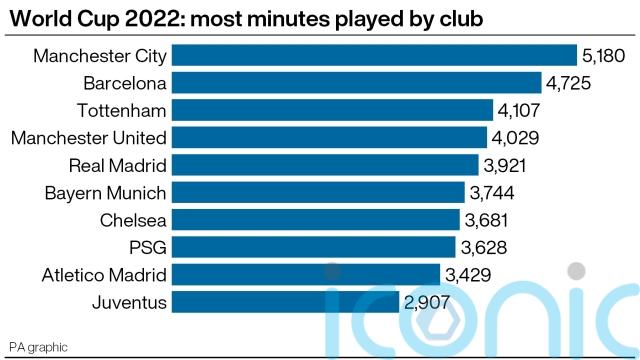 Manchester City topped the list of most-represented clubs in Qatar, with their contingent combining for more than 5,000 minutes.